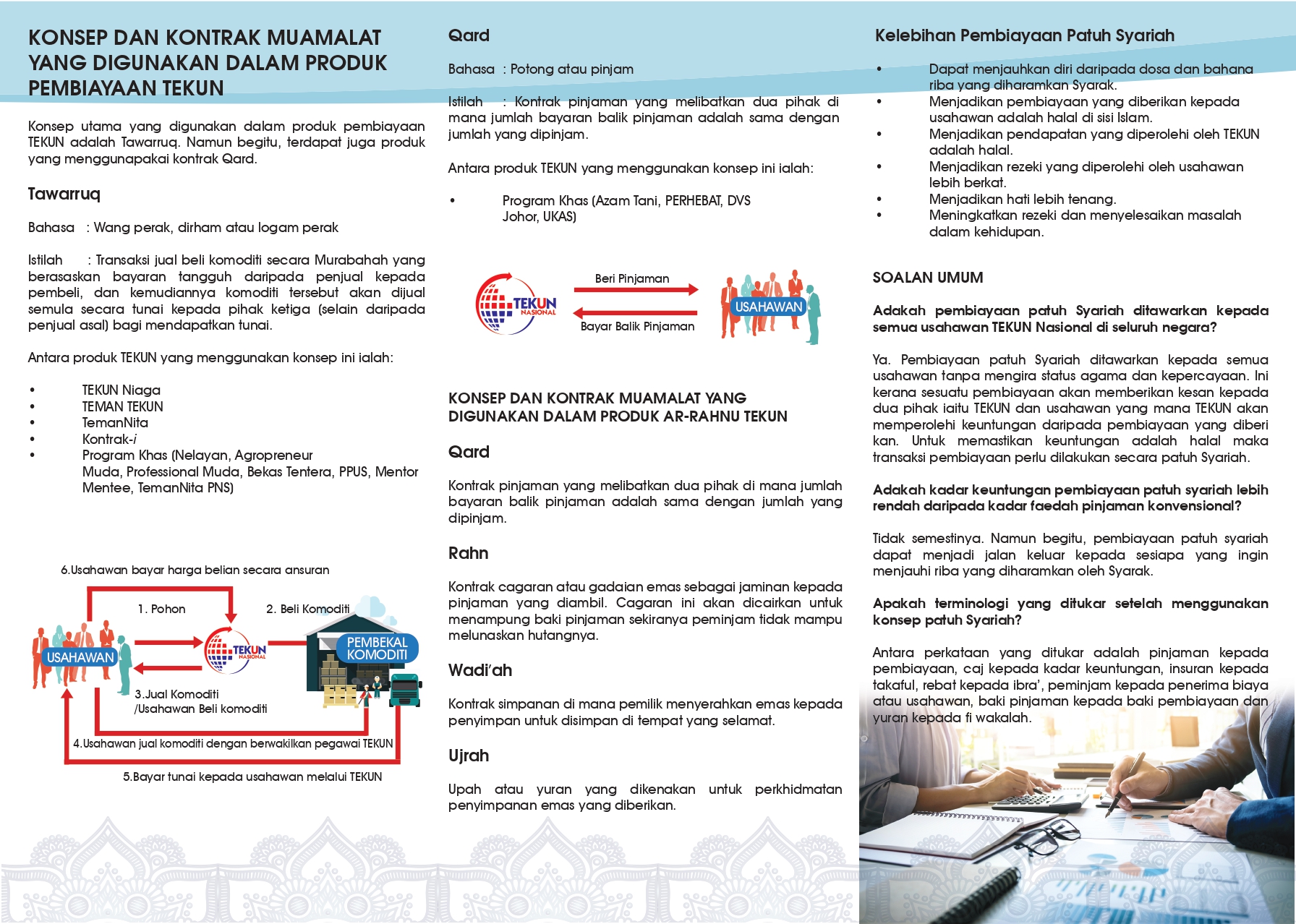 Konsep utama yang digunakan dalam produk pembiayaan TEKUN adalah Tawarruq. Namun begitu, terdapat juga produk yang menggunapakai kontrak Qard.