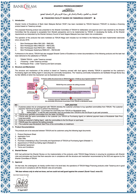 TEKUN Nasional telah mendapat pengiktirafan patuh Syariah daripada juru perunding pembiayaan patuh Syariah iaitu Syariah Centre of Excellence Bank Islam Malaysia Berhad pada tahun 2017. Sehingga kini semua produk pembiayaan TEKUN yang ditawarkan kepada para usahawan adalah patuh Syariah sepenuhnya.