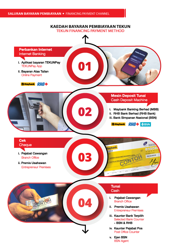 Pejabat TEKUN Cawangan, kutipan oleh Pegawai TEKUN, bayaran melalui mana-mana Bank yang dimaklumkan oleh TEKUN, POS Malaysia, bayaran melalui cek tarikh tertunda (Post Dated Cheque / PDC), bayaran melalui aplikasi elektronik (Direct Debit e-Mandate) atau melalui kaedah lain yang ditetapkan oleh TEKUN dari semasa ke semasa.